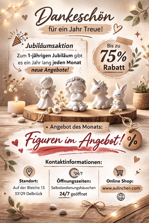 Wir sagen von Herzen Danke für ein wundervolles erstes Jahr! Zu unserem 1-jährigen Jubiläum erwarten dich ein ganzes Jahr lang jeden Monat neue Angebote – mit bis zu 75 % Rabatt. Diesen Monat stehen unsere liebevoll gestalteten Figuren im Mittelpunkt. Komm vorbei oder stöbere online und sichere dir dein Lieblingsstück!