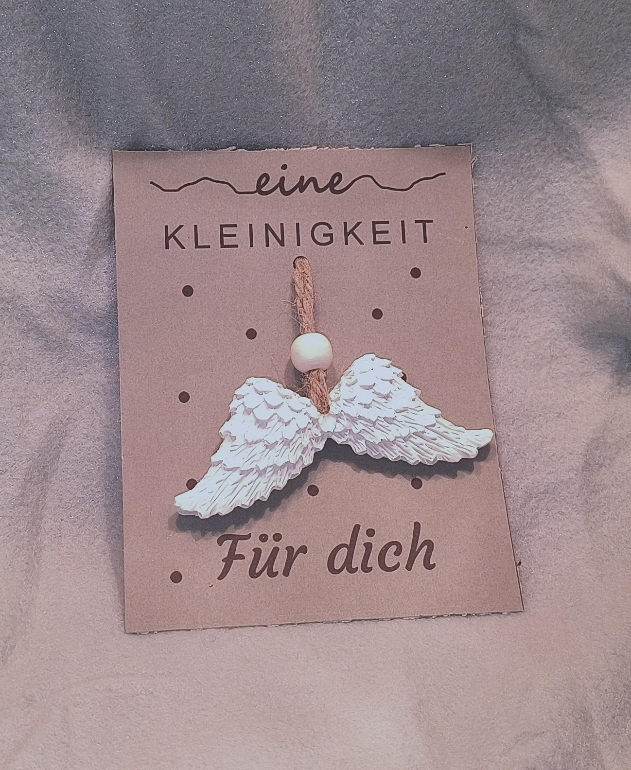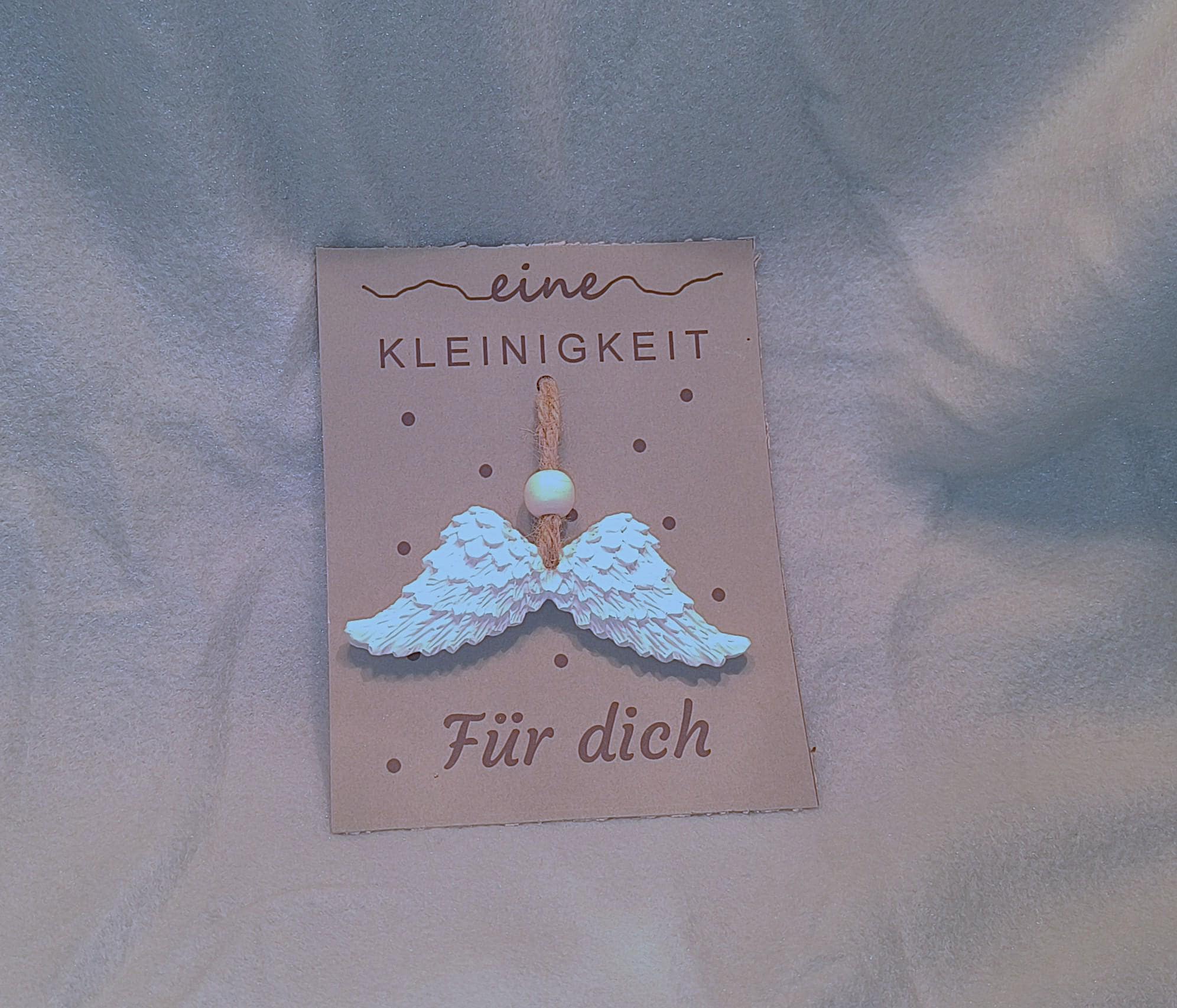 These delicate angel wings are crafted from high-quality casting powder and stylishly attached with a cord and a wooden ball. Presented on a printed card made of sturdy cardboard, this unique piece is ideal as a gift, guardian angel, or loving decoration.