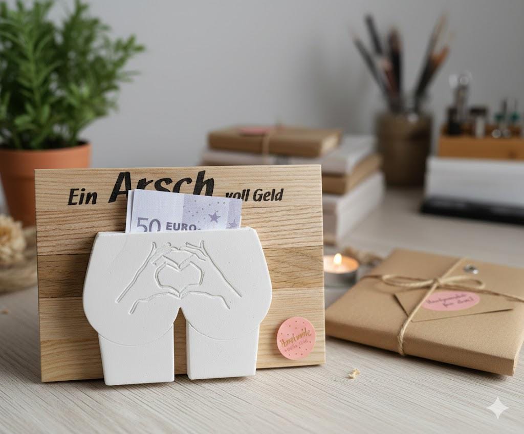 This creative decoration features a handcrafted Raysin's butt with a heart-shaped hand gesture and offers space for a banknote (not included). Whether as a cheeky birthday present, for a bachelorette party, or simply as a humorous surprise, this gift is guaranteed to bring laughs and be remembered.