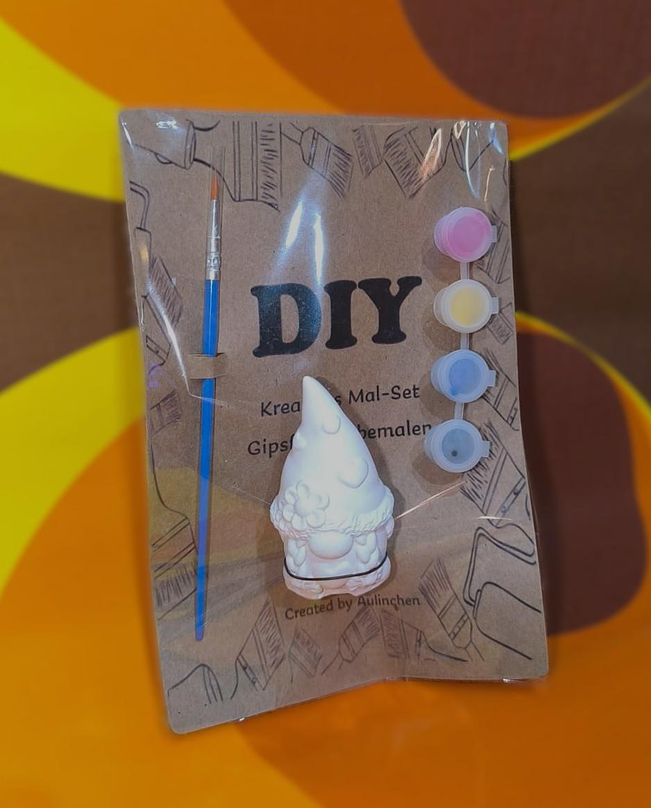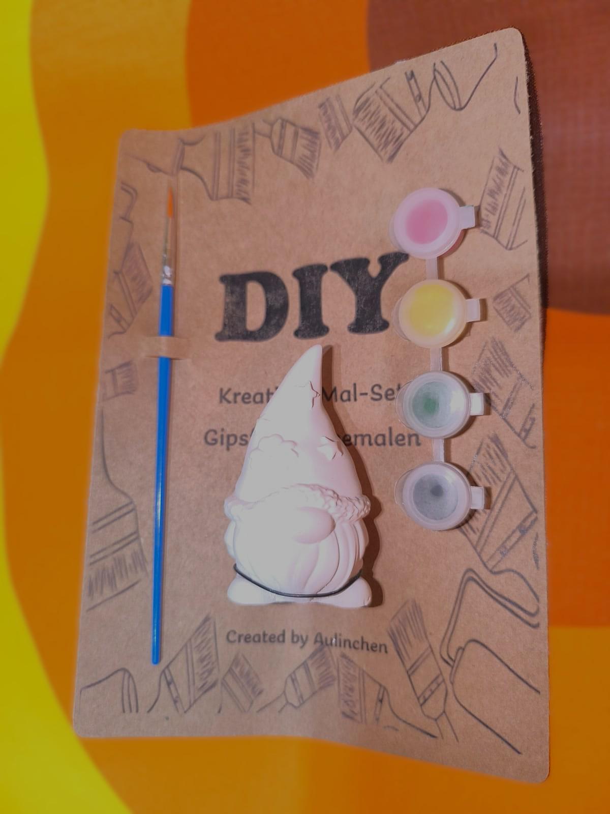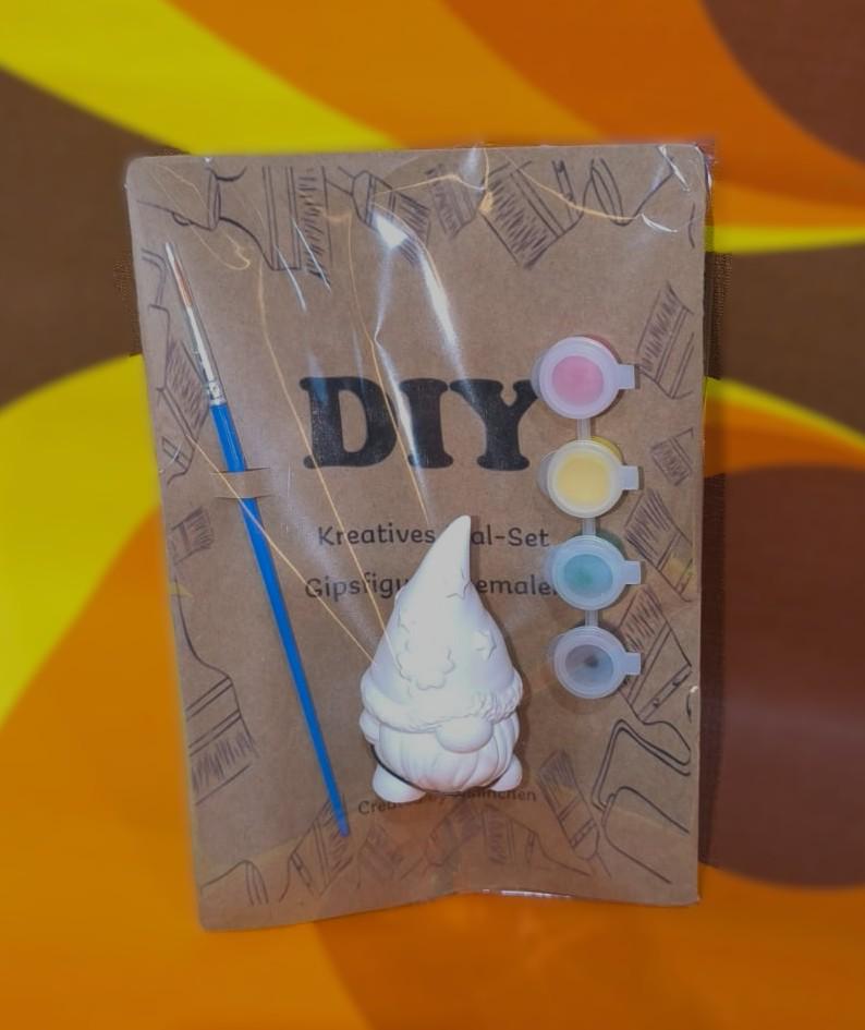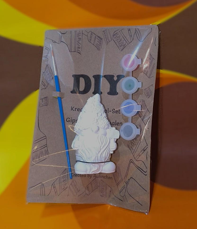 In this set you will find a handmade plaster gnome (approx. 8 cm high), 4 high-quality acrylic paints, a fine brush and plenty of room for your imagination.