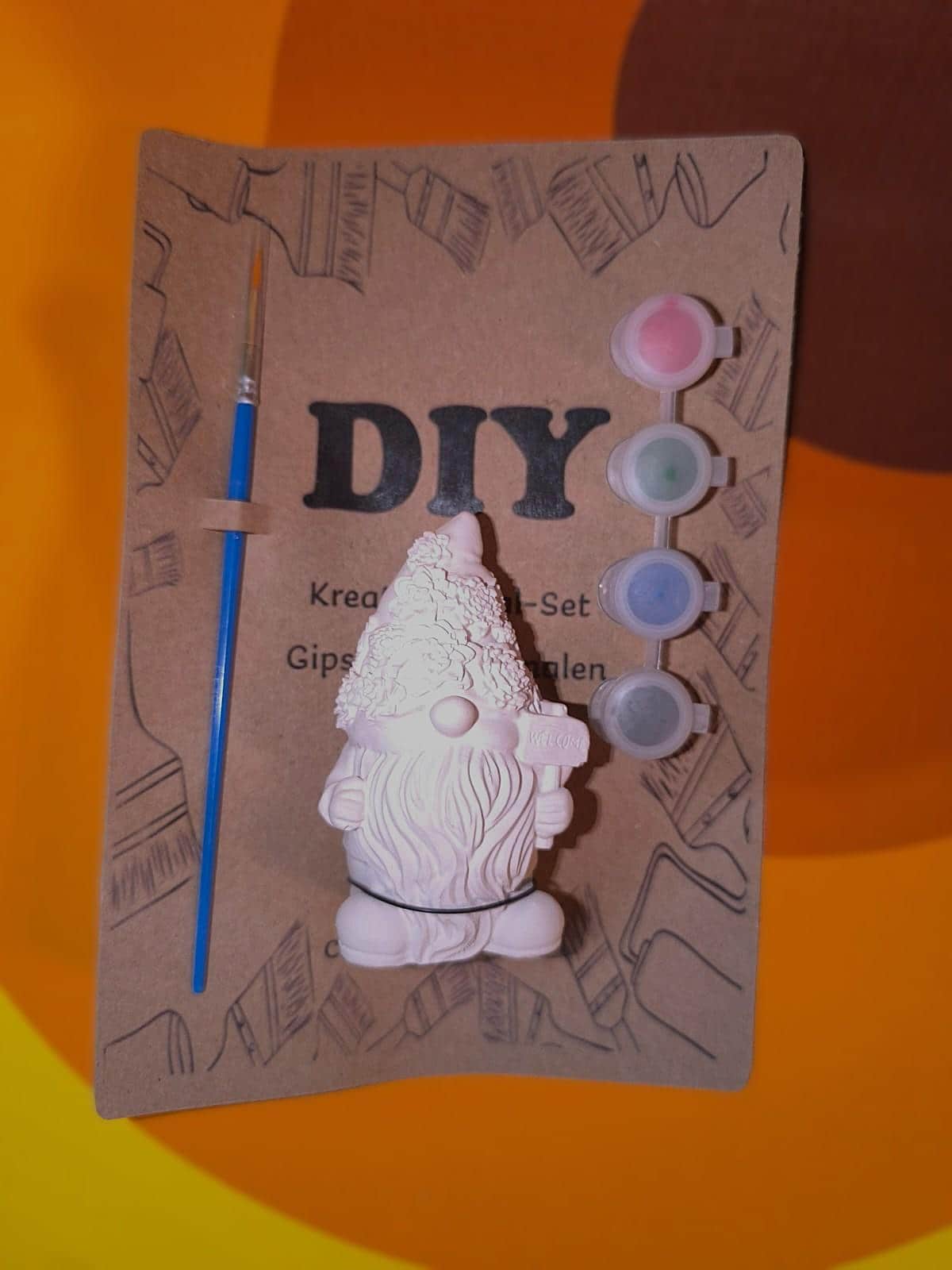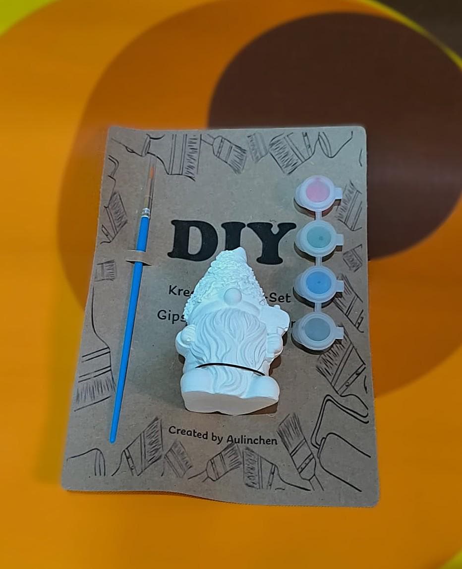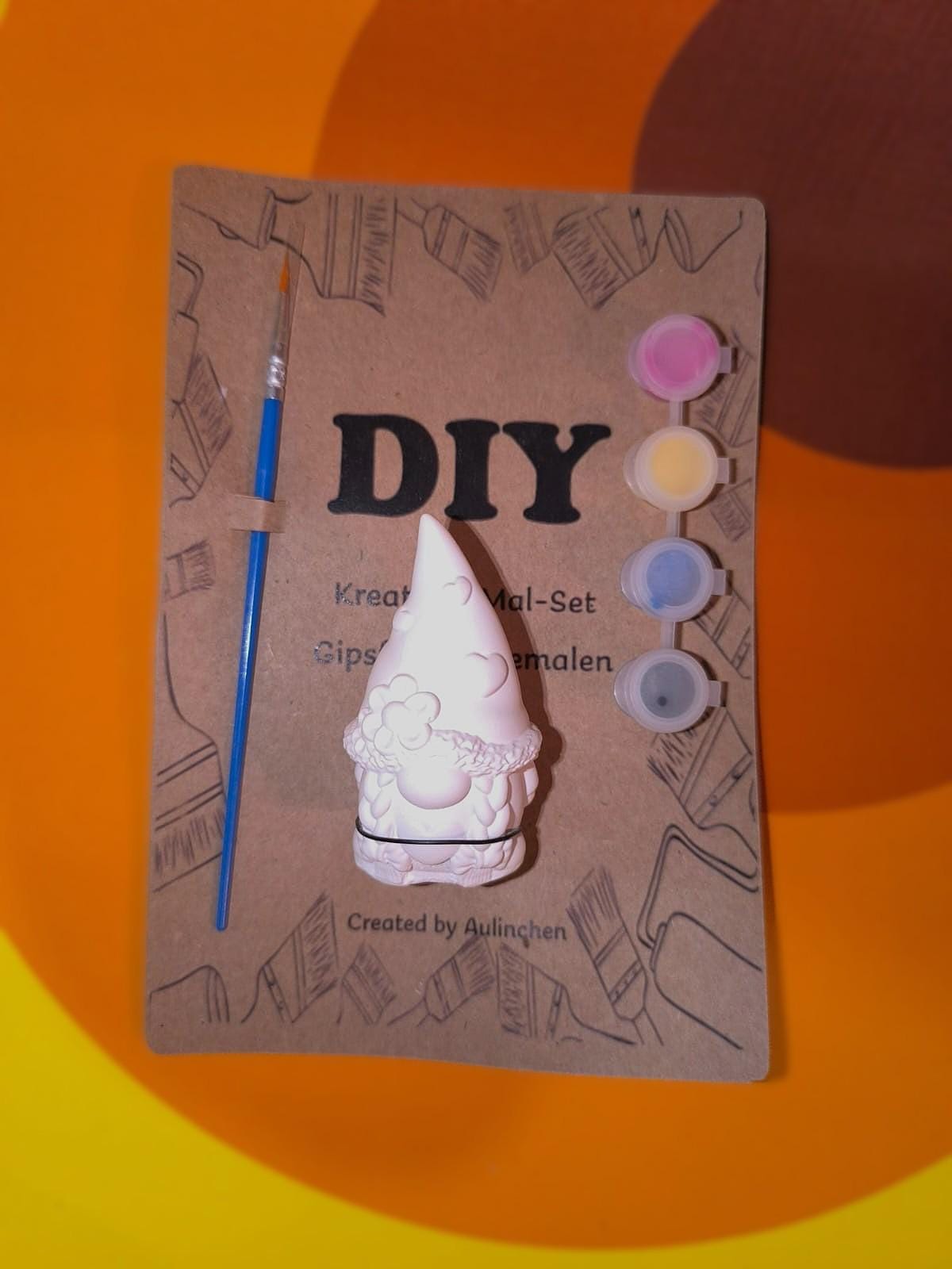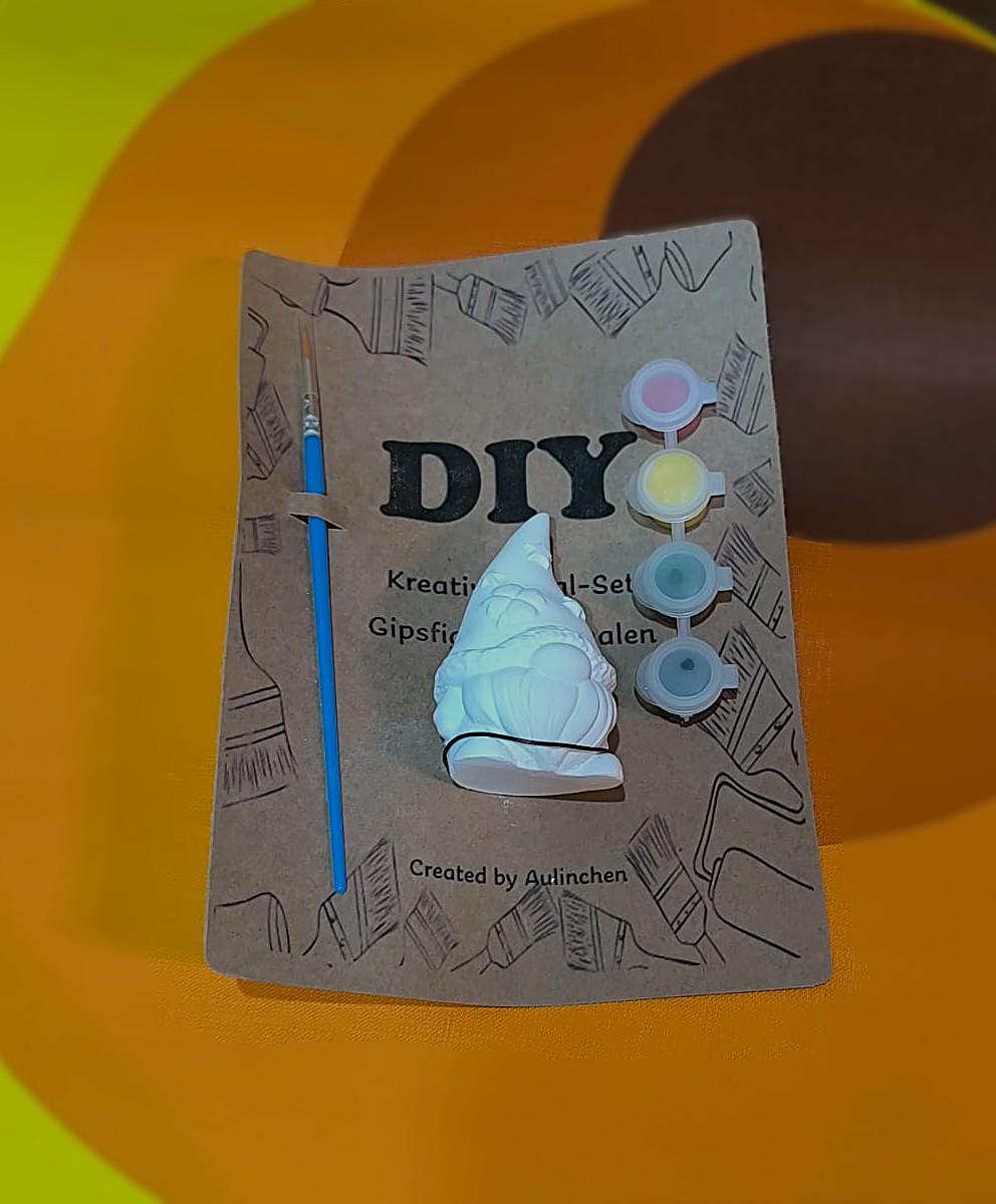 In this set you will find a handmade plaster gnome (approx. 8 cm high), 4 high-quality acrylic paints, a fine brush and plenty of room for your imagination.