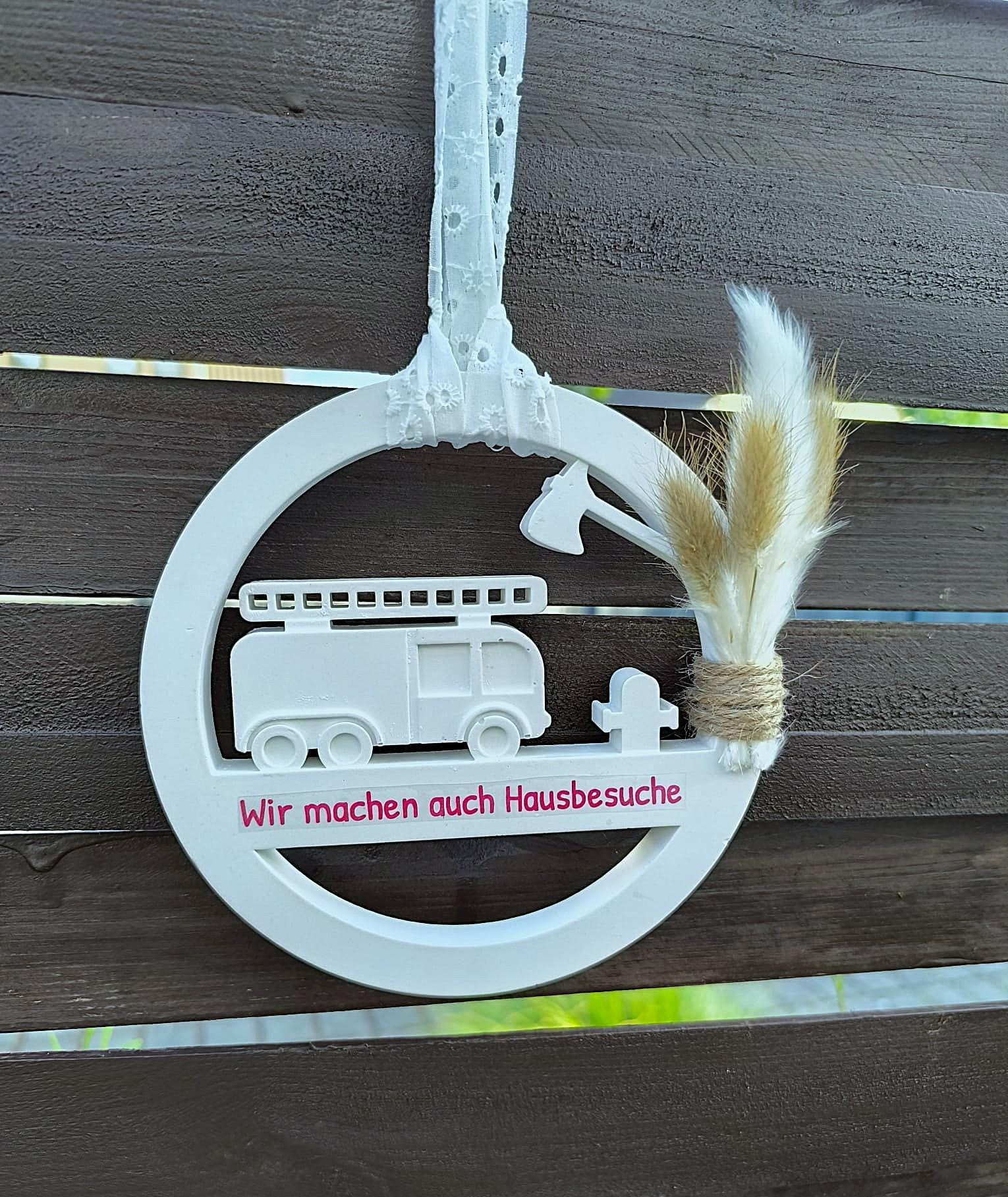 Lovingly designed fire brigade loop made of high-quality Kerafun relief casting powder, decorated with decorative dried flowers and an inscription: