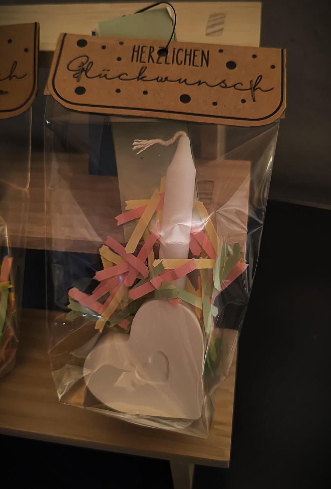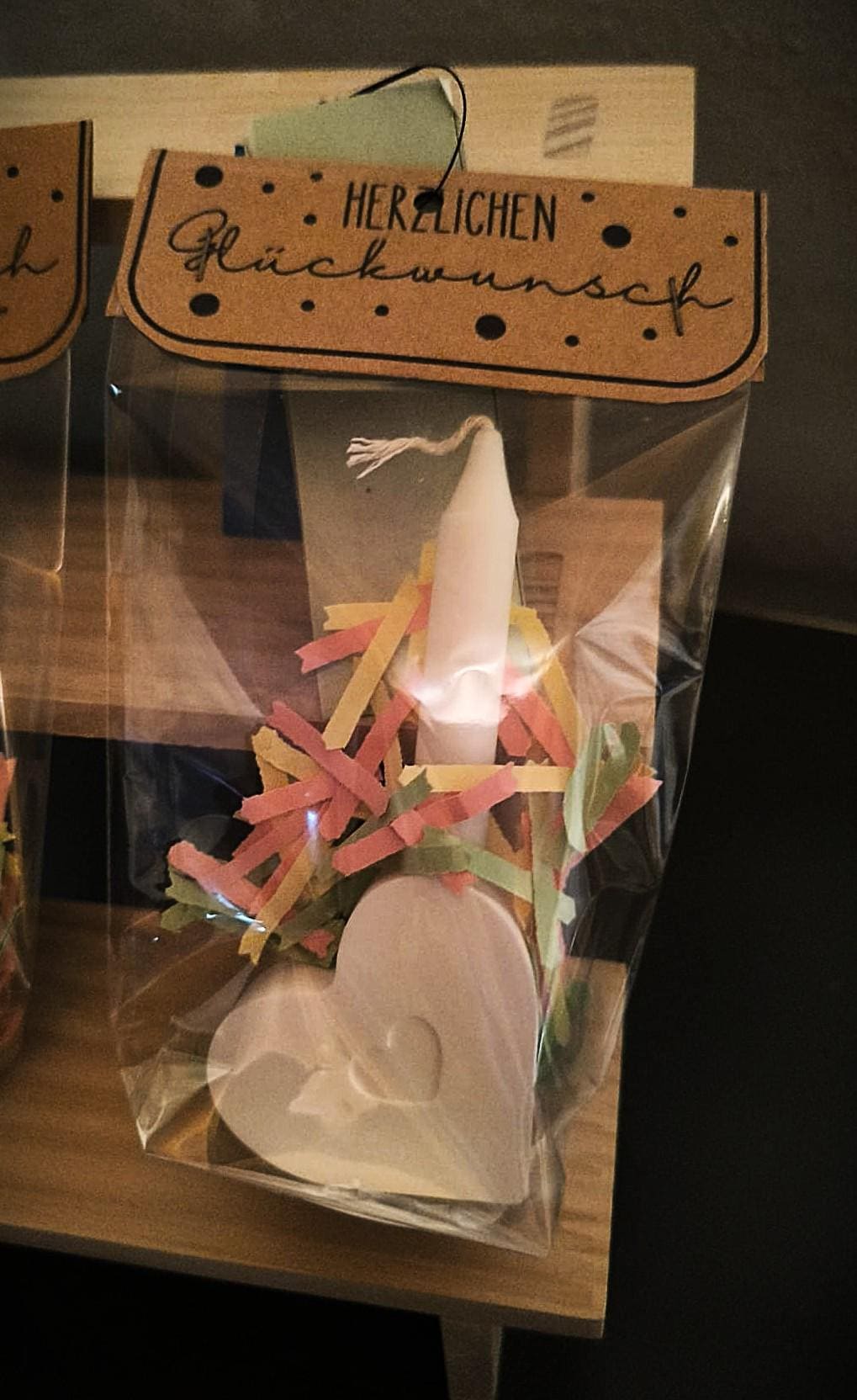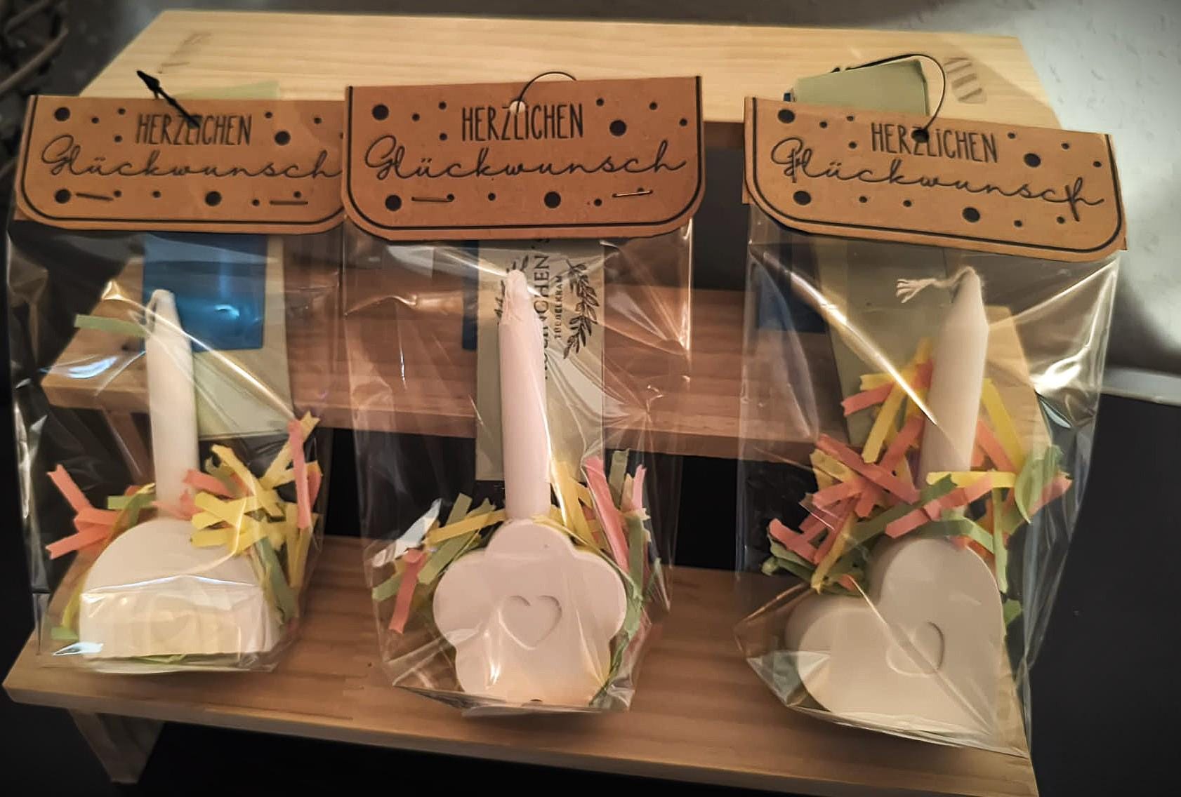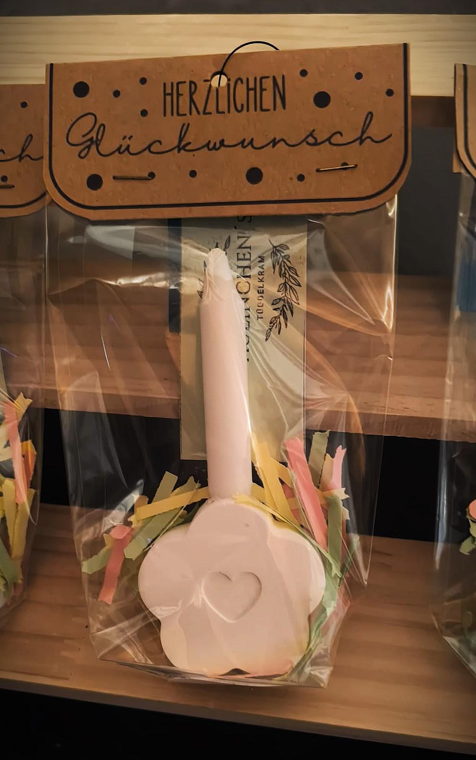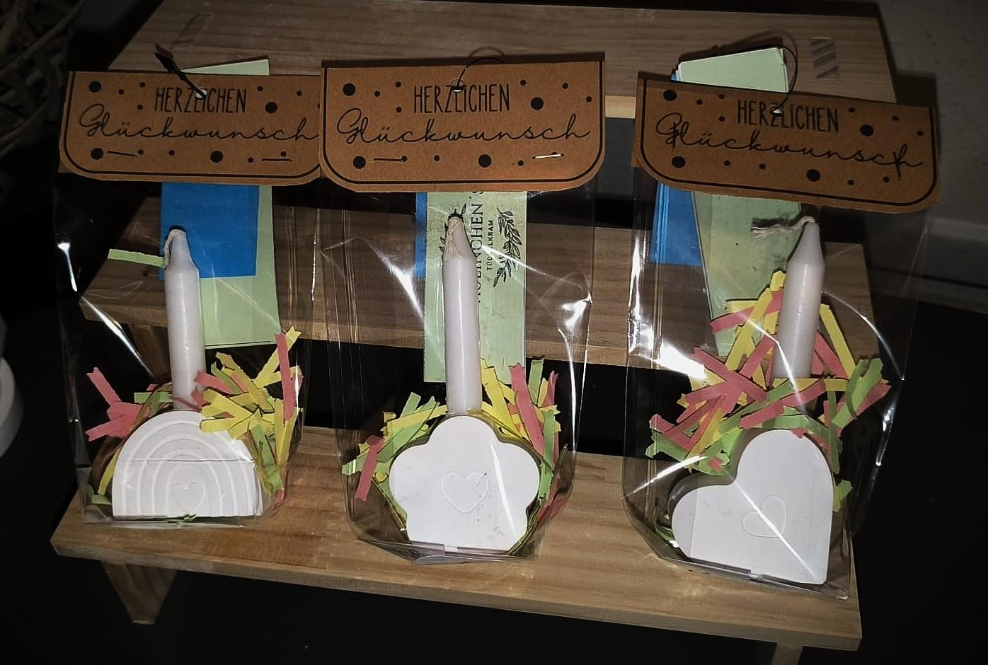 Each bag contains a beautiful ceramic flower with a heart embossing, a matching candle, and colorful paper strips—pretty packaged and ready to give.