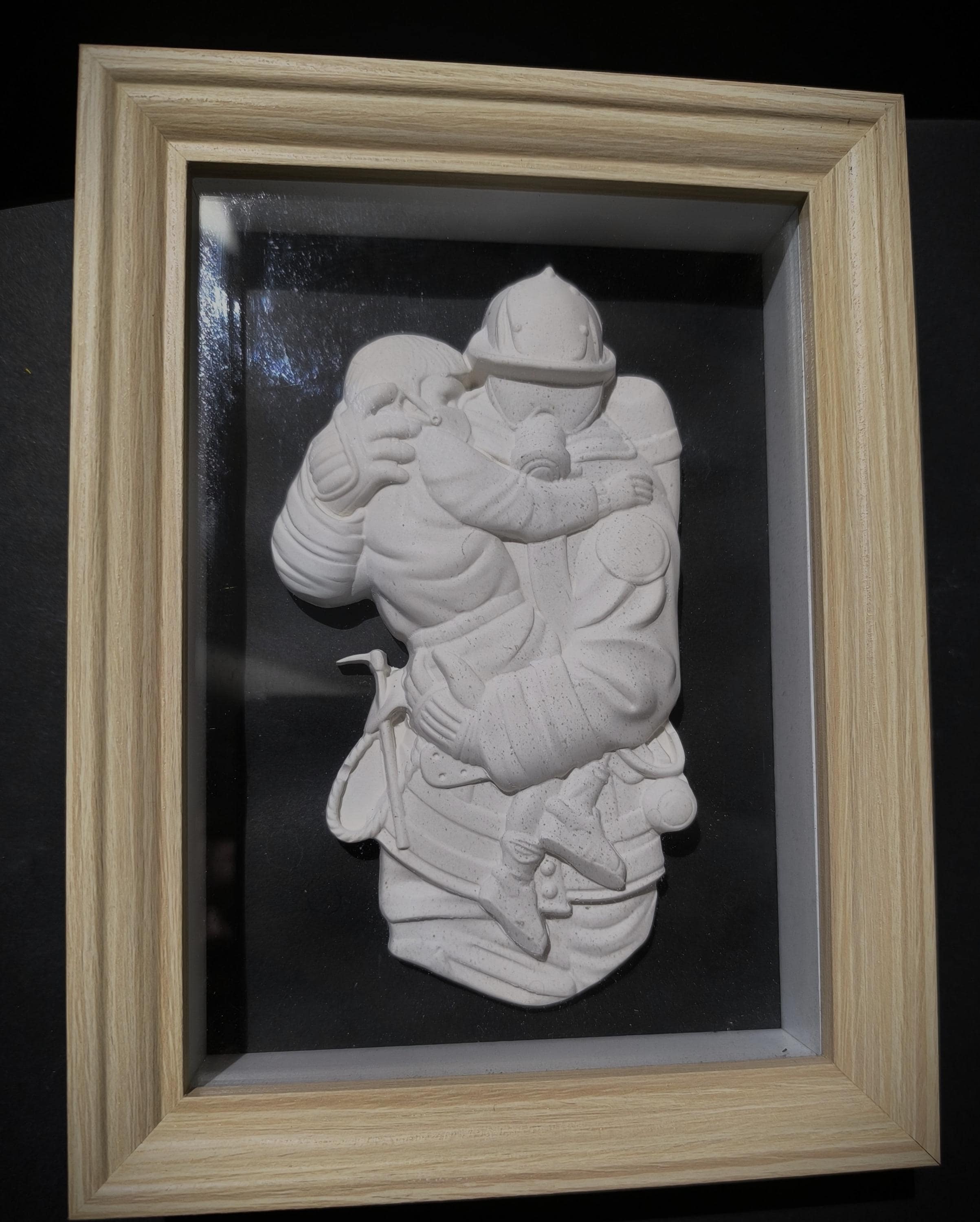 🔥 Heroism in Focus: Framed 3D Relief Fireman & Child