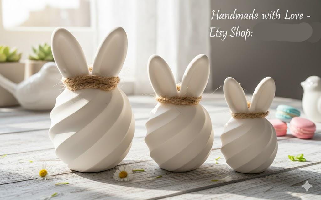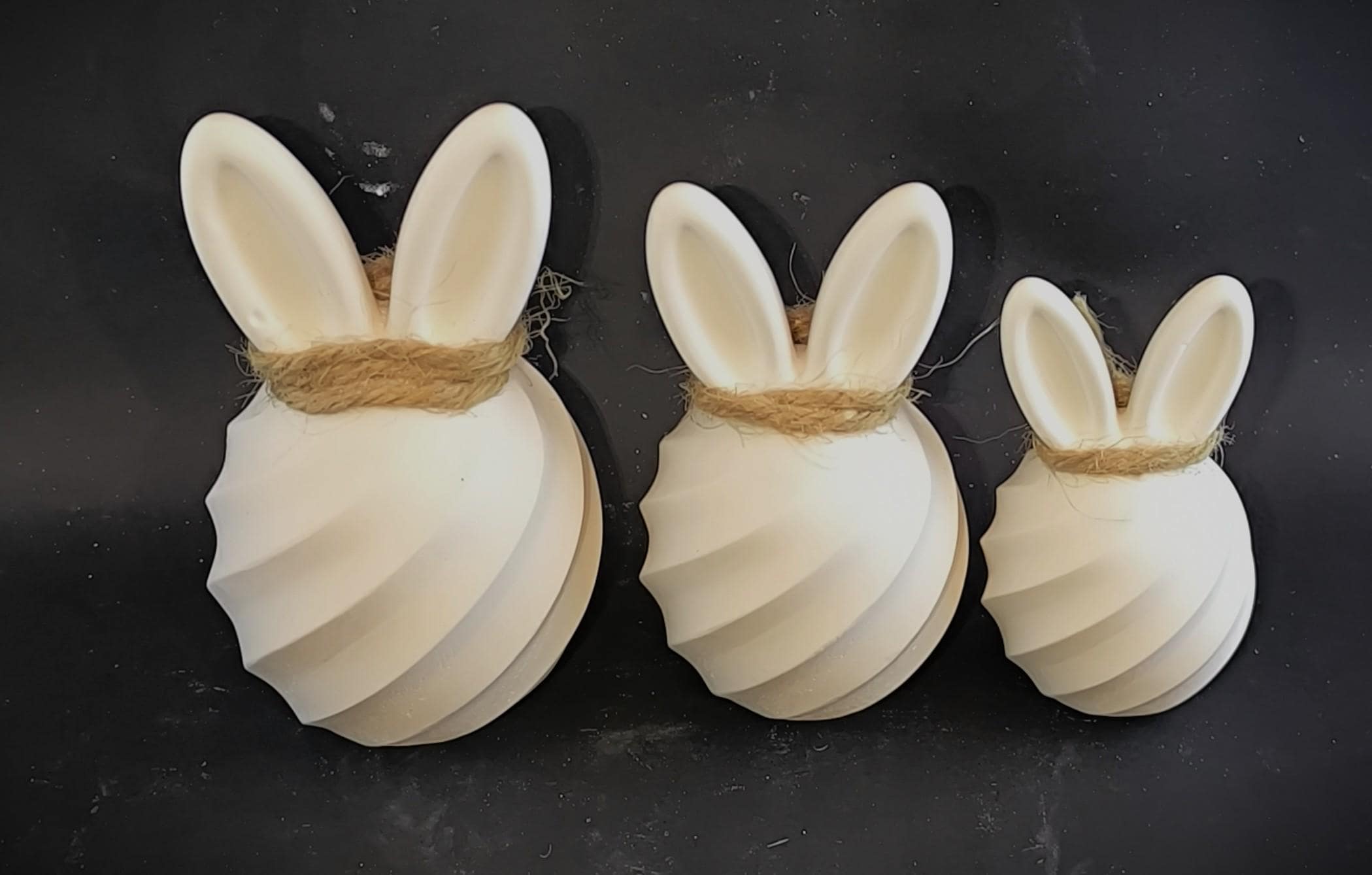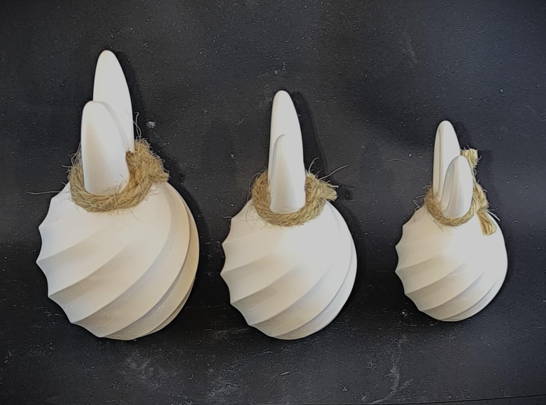 These handcrafted Easter bunnies, made from high-quality white casting powder, impress with their unique spiral design and matte, velvety surface. Each set is cast with meticulous attention to detail and finished with a rustic jute ribbon – the perfect contrast between modern form and natural charm.
