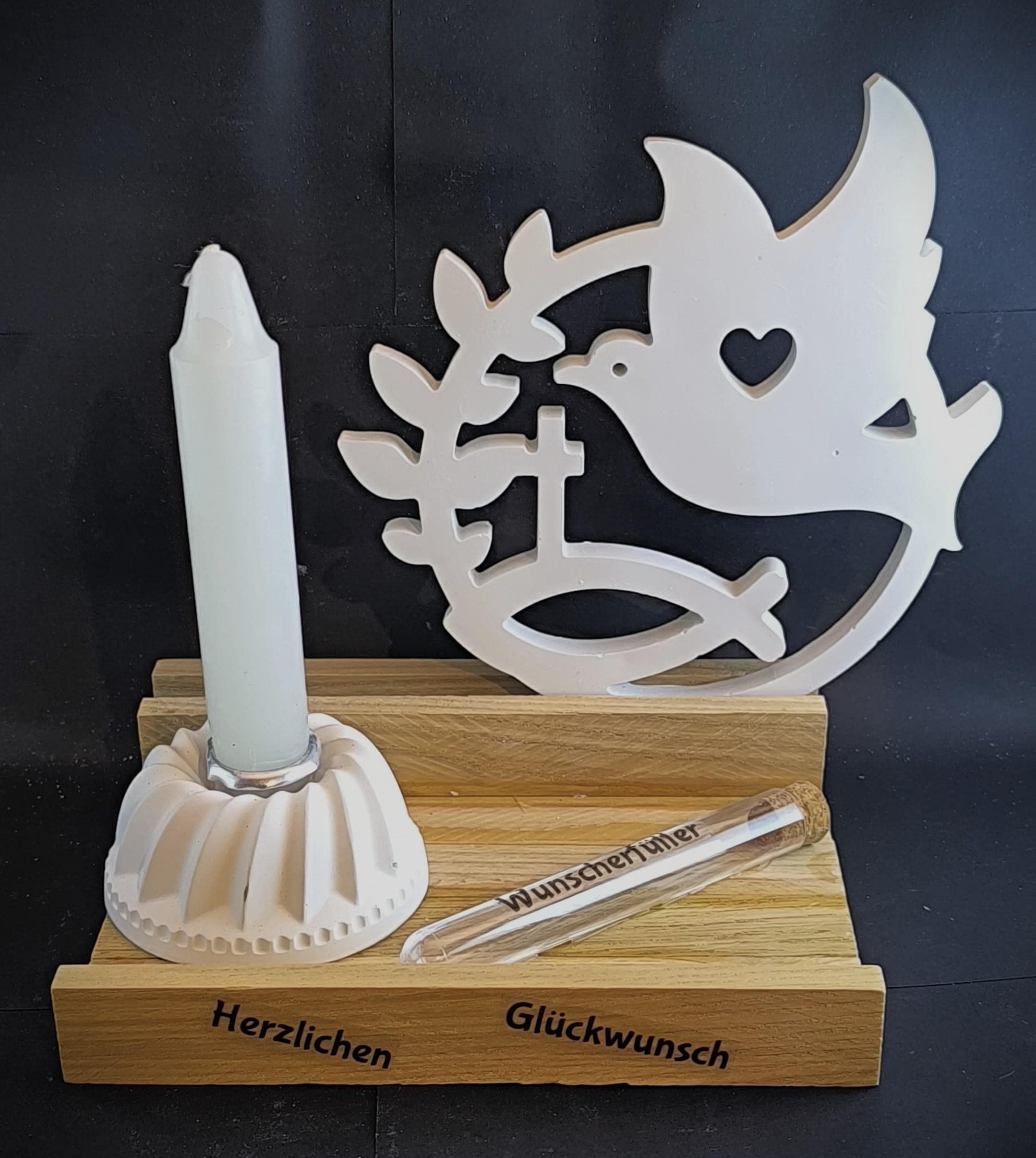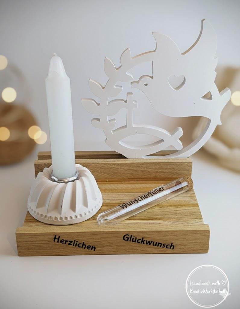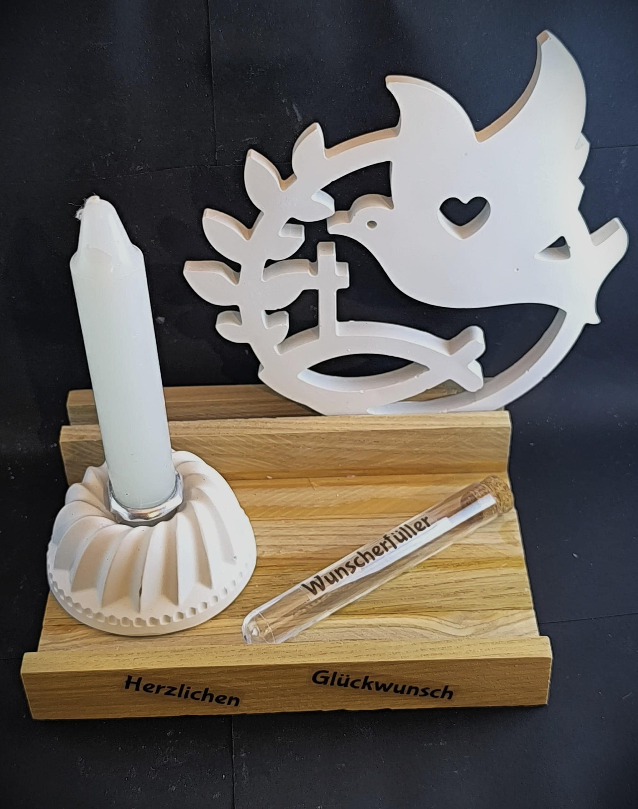 Are you looking for a heartfelt gift for a First Communion, Confirmation, or Baptism? This lovingly assembled set made of high-quality casting powder (Raysin/Keraflott) and warm oak wood combines modern aesthetics with Christian symbolism.