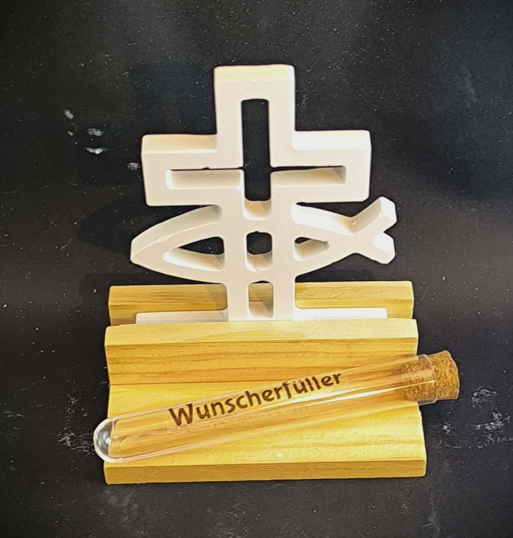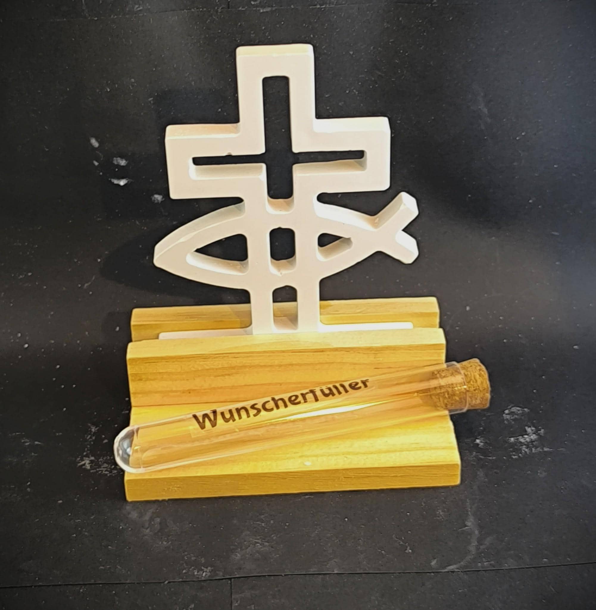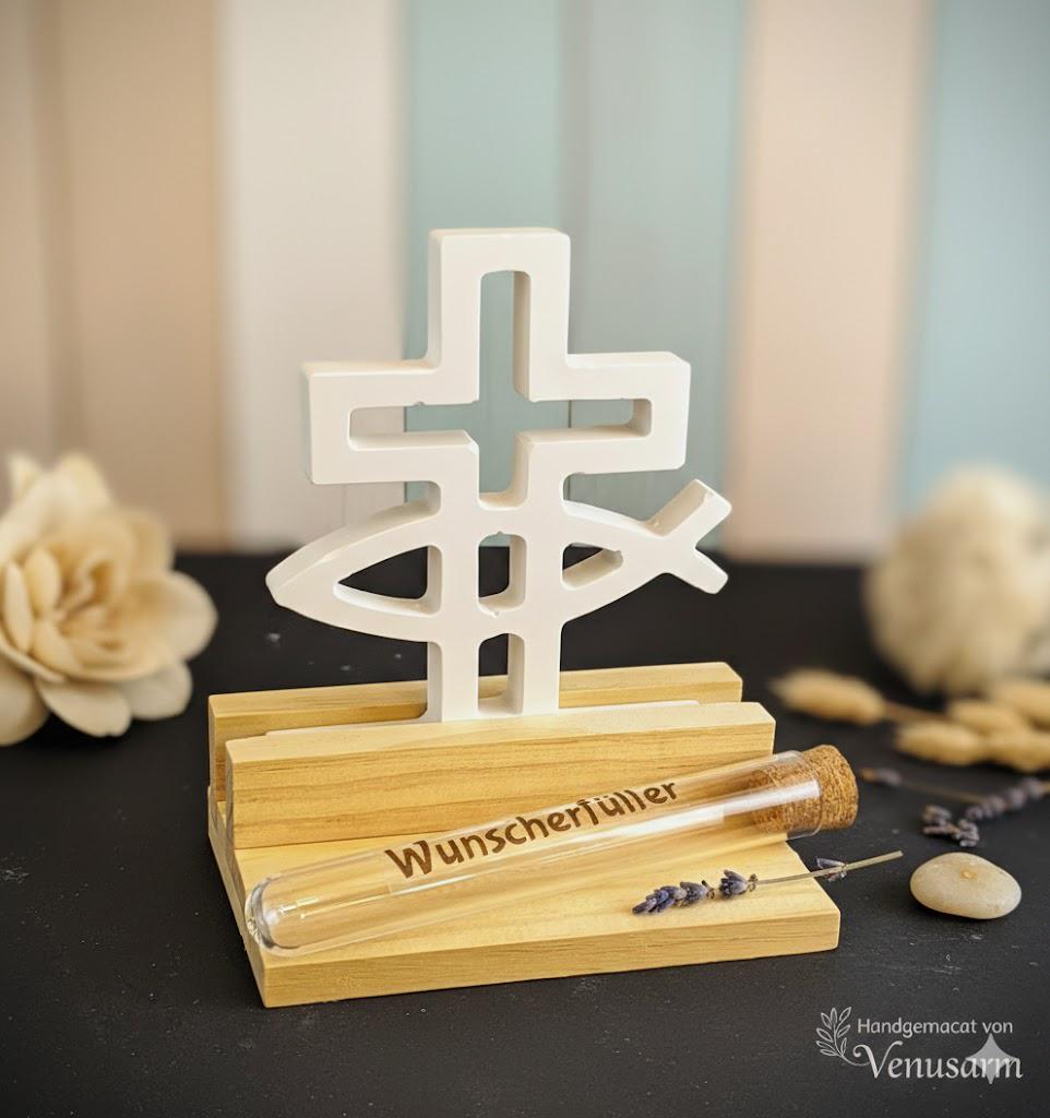 The set consists of an elegant stand that blends the cross and the fish symbol (Ichthys) in a clean, minimalist design. The matching wooden base holds the "Wishing Filler" test tube – ideal for stylishly presenting banknotes, loving messages, or small mementos.