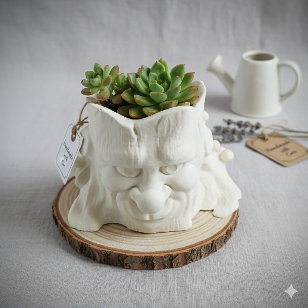 This meticulously crafted planter, made from high-quality casting powder (Raysin/plaster style), is more than just a vessel – it's a character with a soul. Its gentle features and elegant, matte finish make it a true eye-catcher on any shelf or windowsill.