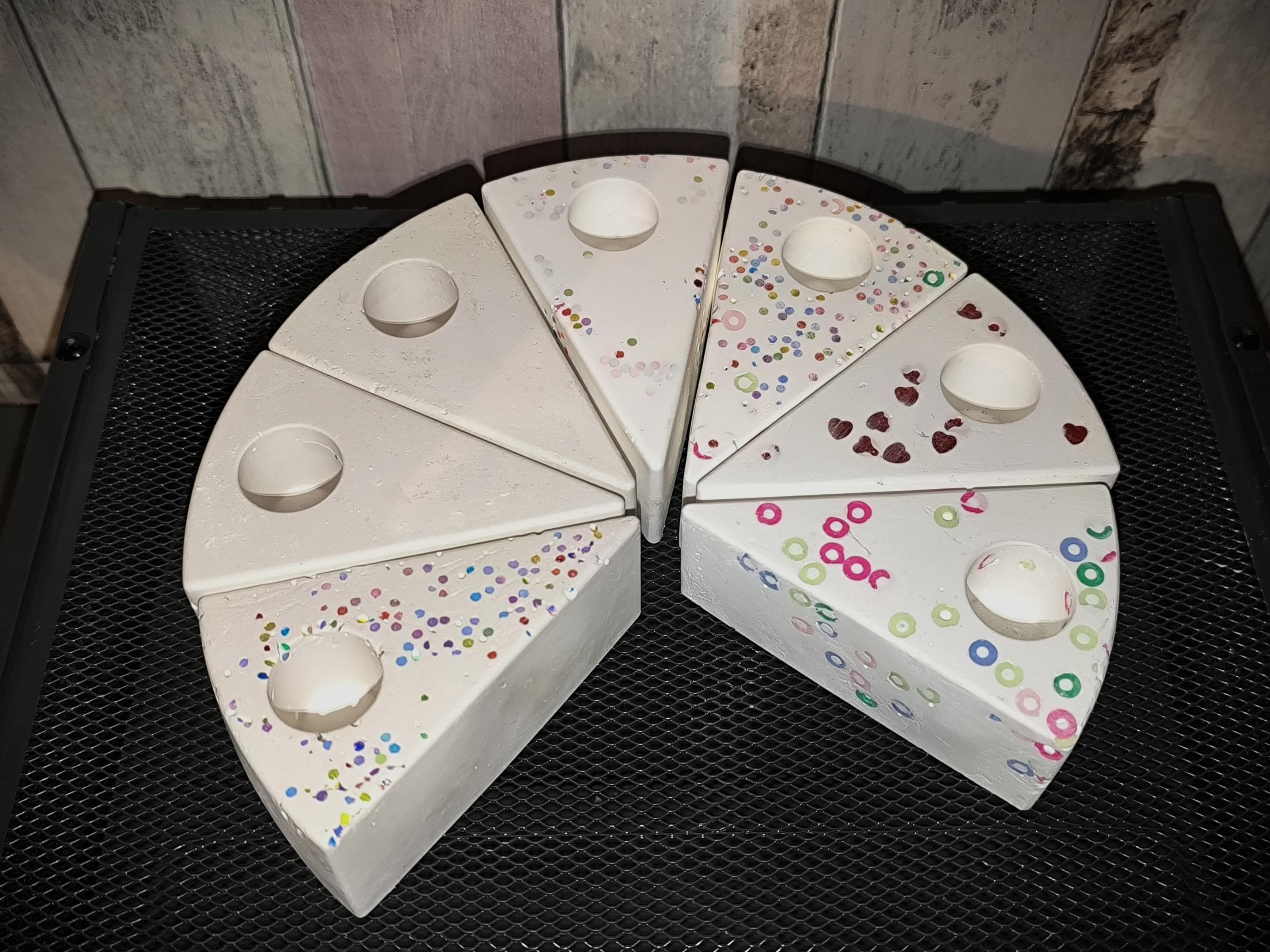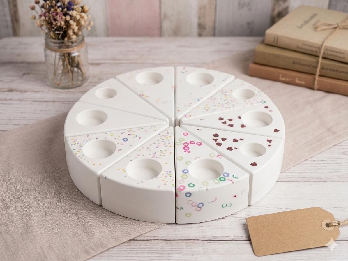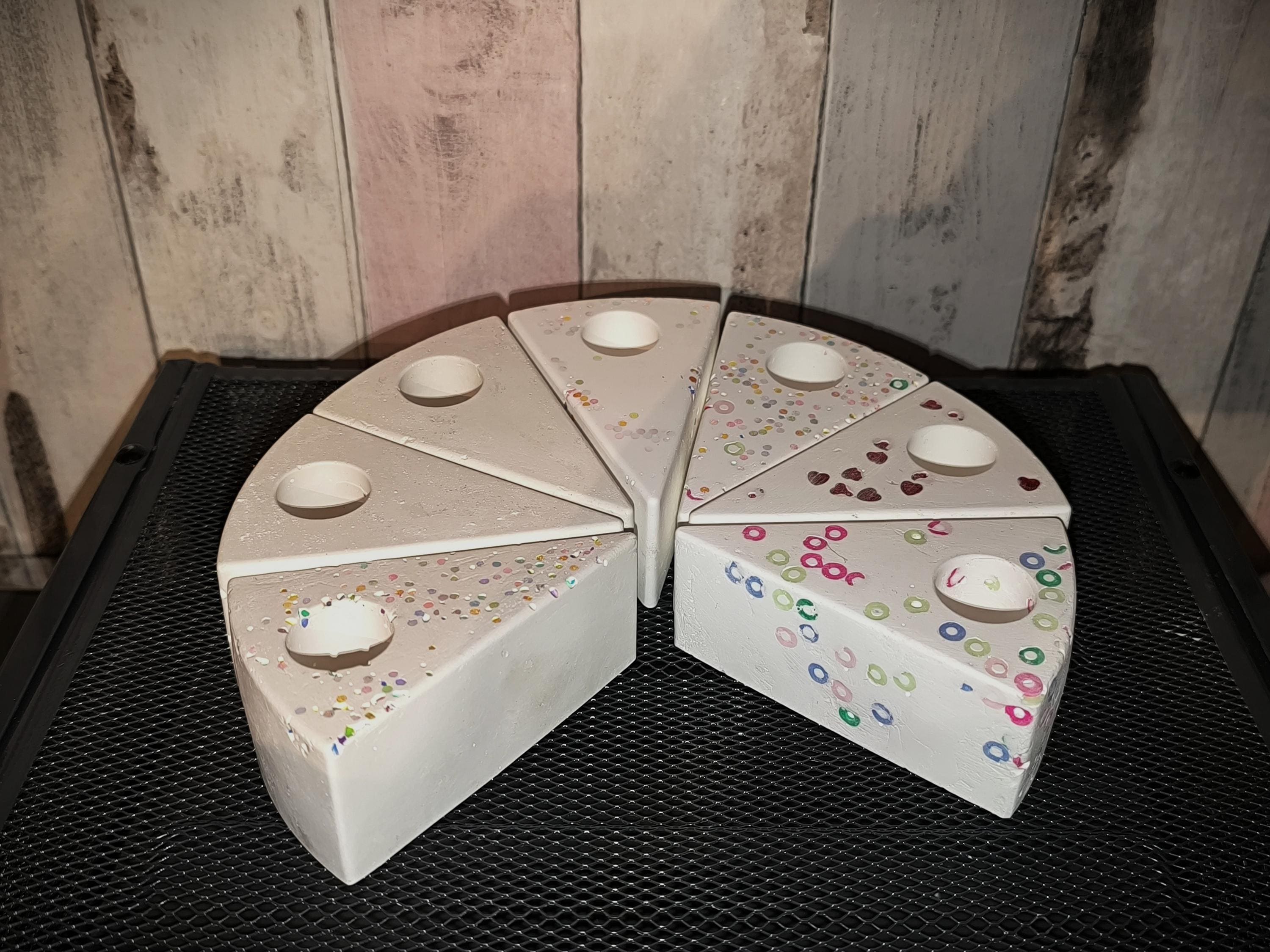 Perfect as candle holders for a birthday table or as timeless decorations. Who needs perfection when you can have a unique piece with character? Go for it and give these "special" cake slices a new home!
