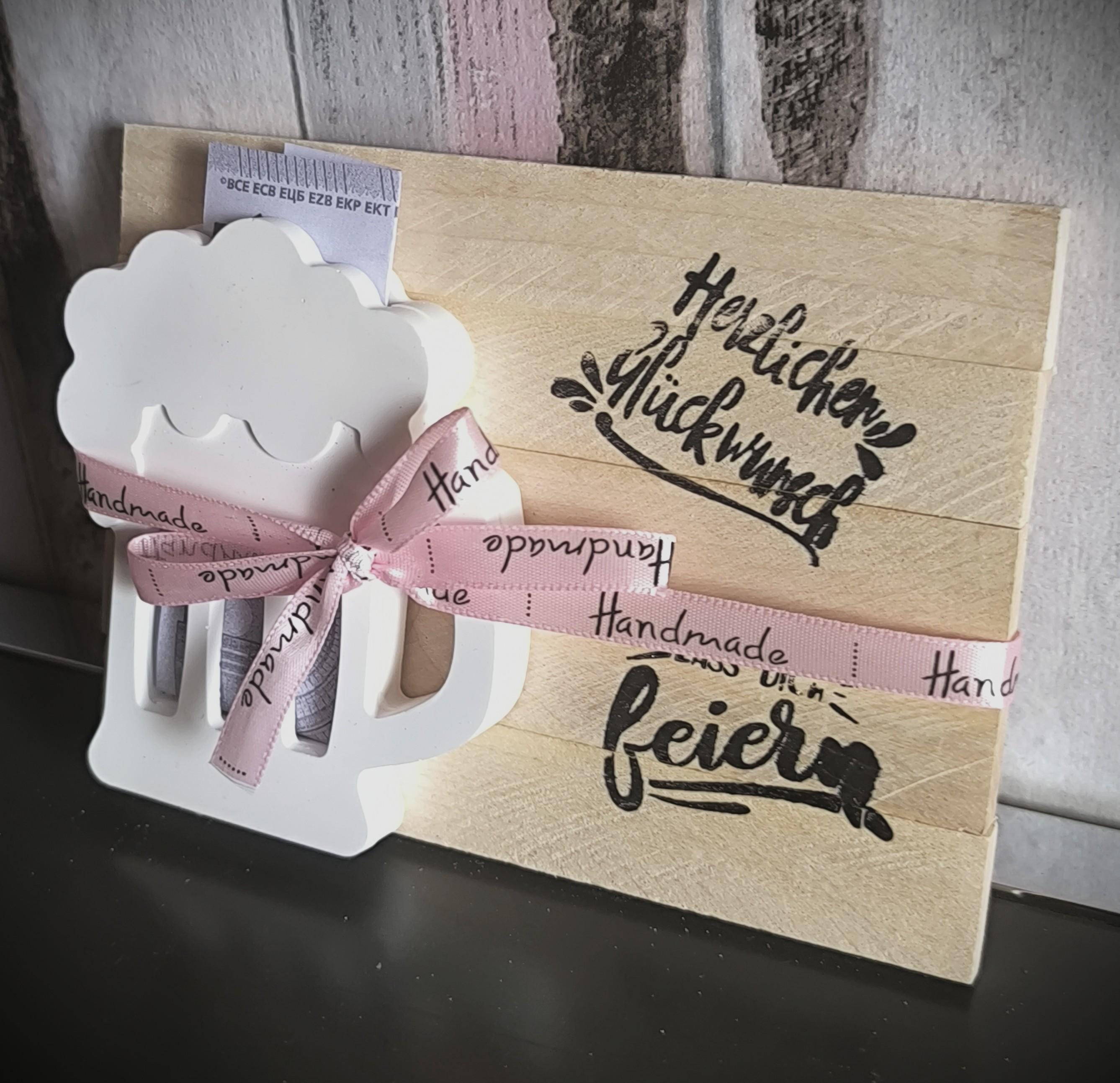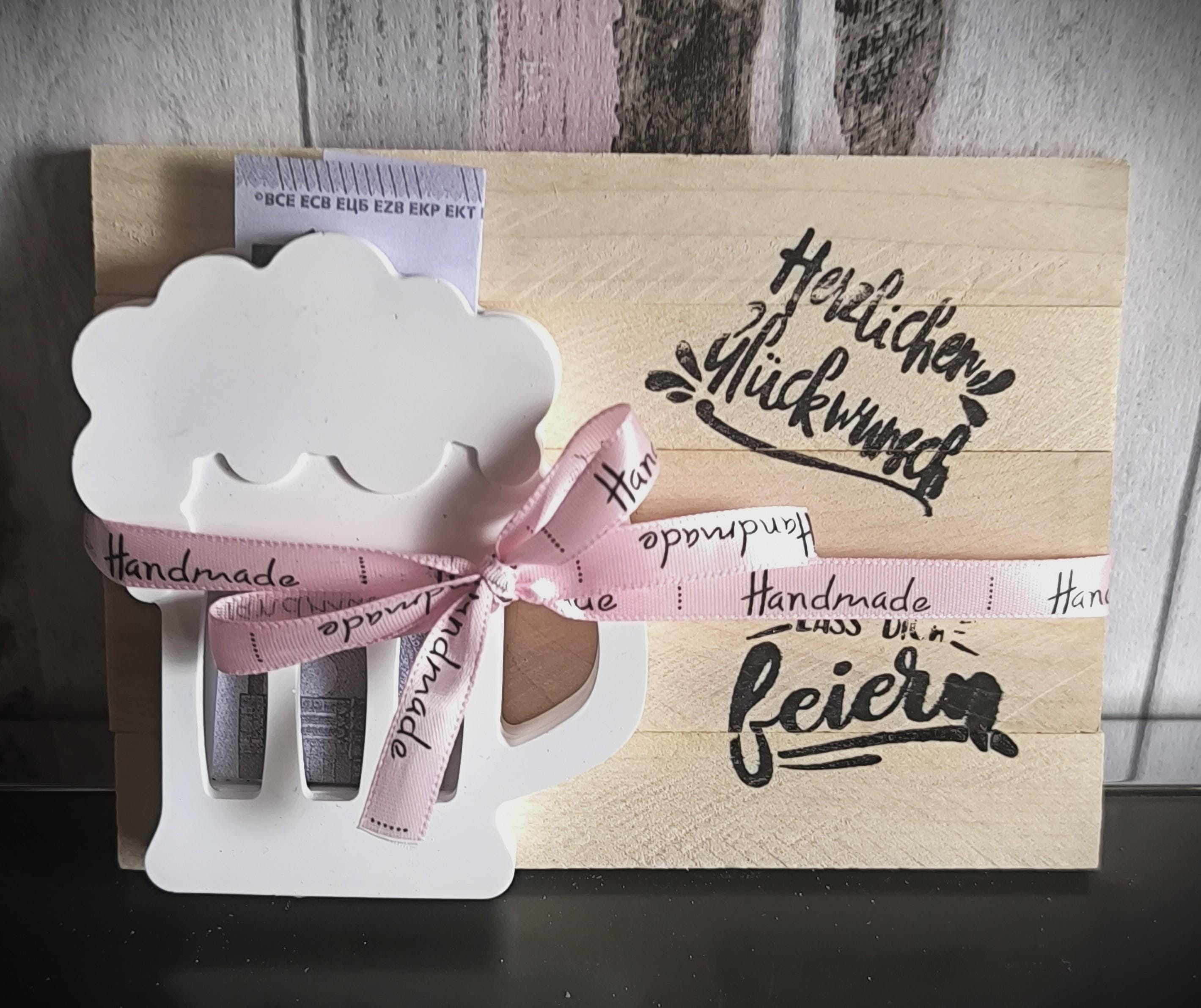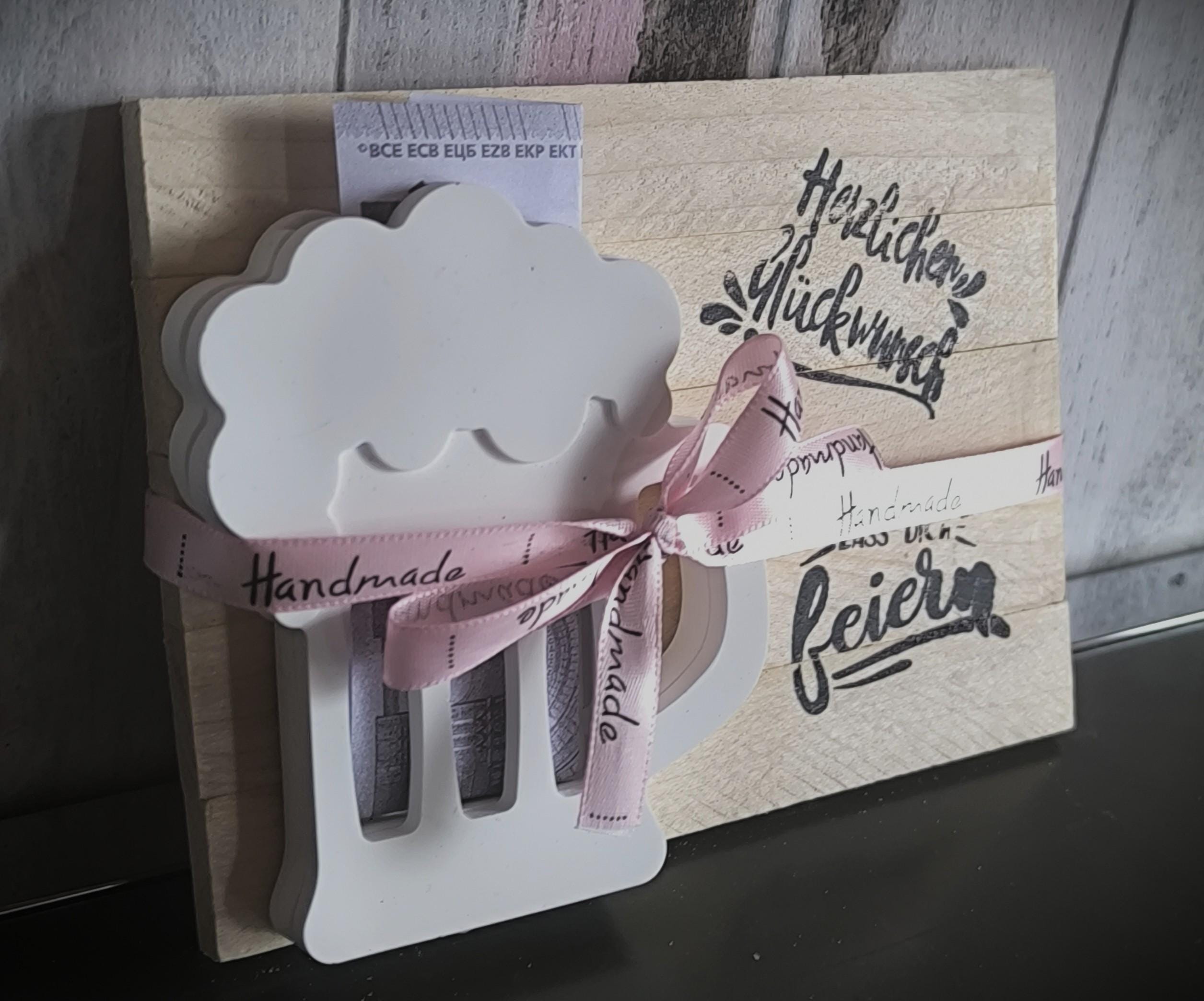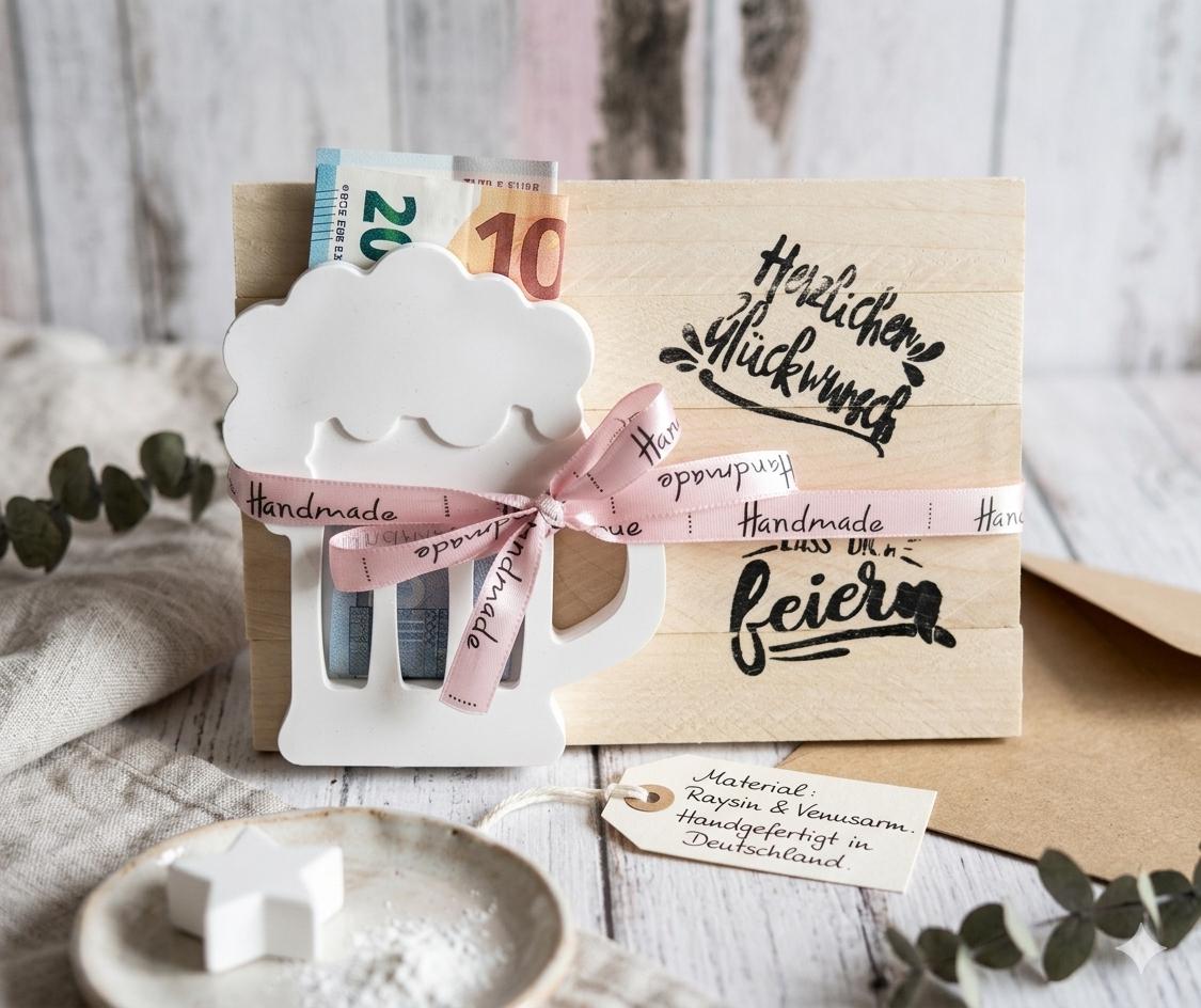 A beer that never goes flat! 🍻 Looking for a way to present cash that doesn't look like you just grabbed something at the gas station at the last minute? Look no further! Our handcrafted beer mug, made from the finest casting powder and finished with a rustic, reclaimed wood look, is the perfect bodyguard for your cash gift. Whether it's for a birthday, an anniversary, or simply because someone deserves a little extra cash, this display stand will stay upright even when the party guests are swaying. Lovingly hand-poured, stylishly tied, and ready for its grand entrance. Cheers to the birthday person! 📖 Legal and Material Information: The background of the first product image has been AI-enhanced. The description was also generated with AI support. The product itself is unchanged and corresponds to reality. Small bubbles or irregularities are inherent to the material and not grounds for complaint. Variations in color and size are possible. Prices are total prices plus shipping, exempt from VAT according to §19 UStG. 📖 GPS data: 🤲Manufacturer: Aulinchen's Tüddelkram – Anke Rehkämper, Auf der Bleiche 13, 33129 Delbrück, aulinchens-tueddelkram[!at]gmx.de ⭐️Item number: 26072